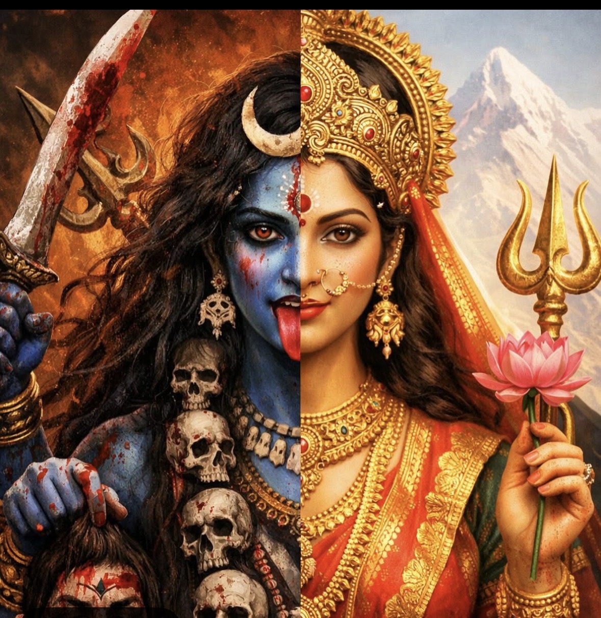 Goddess Parvati and Goddess Kali are 2 forms of the Divine feminine. Parvati represents love, compassion, fertility, devotion and the nurturing power of the universe. She symbolizes harmony, family and the gentle strength that supports life and creation. Ma Kali on the other side represents fierce protection, transformation and destruction of evil and ignorance in the world. Her powerful form symbolizes time, change and the force that removes negativity to restore cosmic balance.